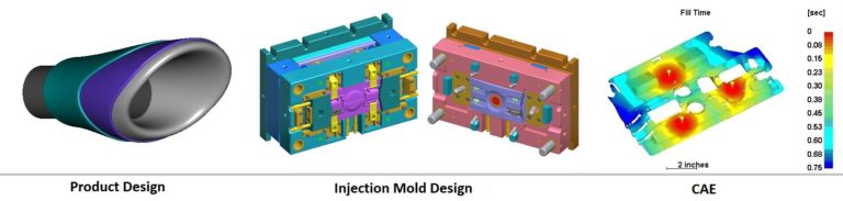 Capabilities include product design, injection mold design, part & mold filling analysis, structural FEA, reverse engineering, class 'A' surfacing, design for injection molding and design for assembly. Design tools include PTC Creo, Siemens NX, Ansys DesignSpace, Moldflow Part Advisor and Autodesk AutoCAD.
